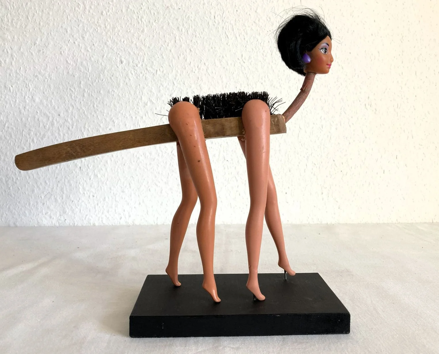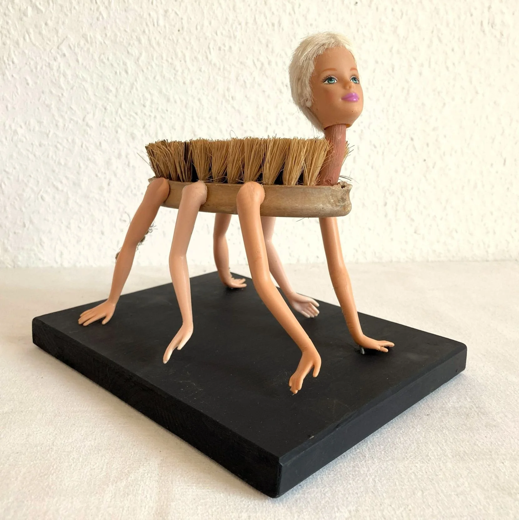 o.T. 2025, Bürste, Barbie-Elemente, 30 x 27 x 12 cm