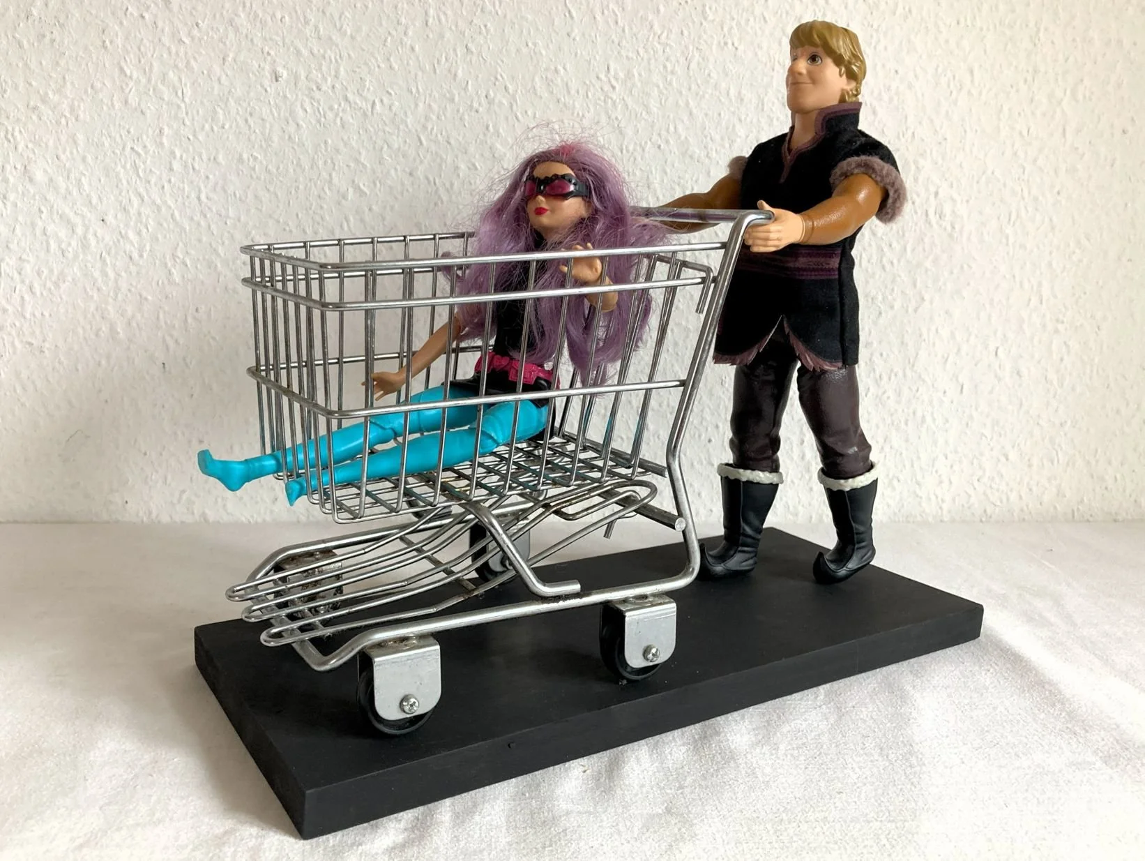 ohne Titel, 2025, Barbiepuppen, kleiner Einkaufswagen, 28 x 35 15 cm